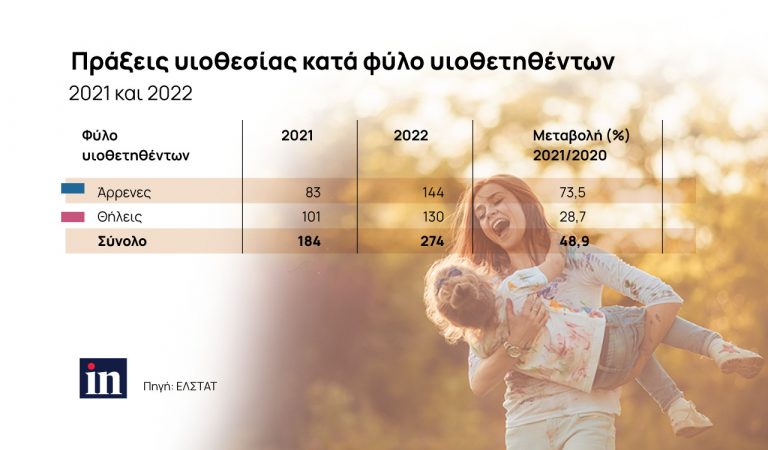 Οι υιοθεσίες στην Ελλάδα κατά το προηγούμενο έτος σημείωσαν αύξηση 48,9%, δηλαδή οι πράξεις υιοθεσίας ανήλθαν σε 274 έναντι 184 το 2021. Οι θετοί γονείς, κατά κύριο λόγο, είναι δύο σύζυγοι και στην κατηγορία αυτή παρουσιάστηκε αύξηση κατά 26,8% (από 127 σε 161) στις πράξεις υιοθεσίας σε σχέση με το 2021.