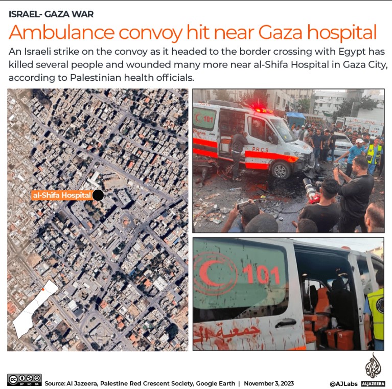 «Γύρω στις 4:05μμ τοπική ώρα, μια αυτοκινητοπομπή ασθενοφόρων έφυγε από το νοσοκομείο Αλ-Σίφα σε συνεννόηση με το υπουργείο Υγείας στη Γάζα.