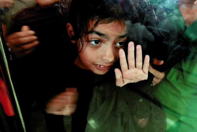 Ένα παιδί κοιτάζει μέσα από το τζάμι του αυτοκινήτου, καθώς Παλαιστίνιοι με διπλή υπηκοότητα περιμένουν στο συνοριακό πέρασμα της Ράφα με την Αίγυπτο, με την ελπίδα να πάρουν άδεια να φύγουν από τη Γάζα