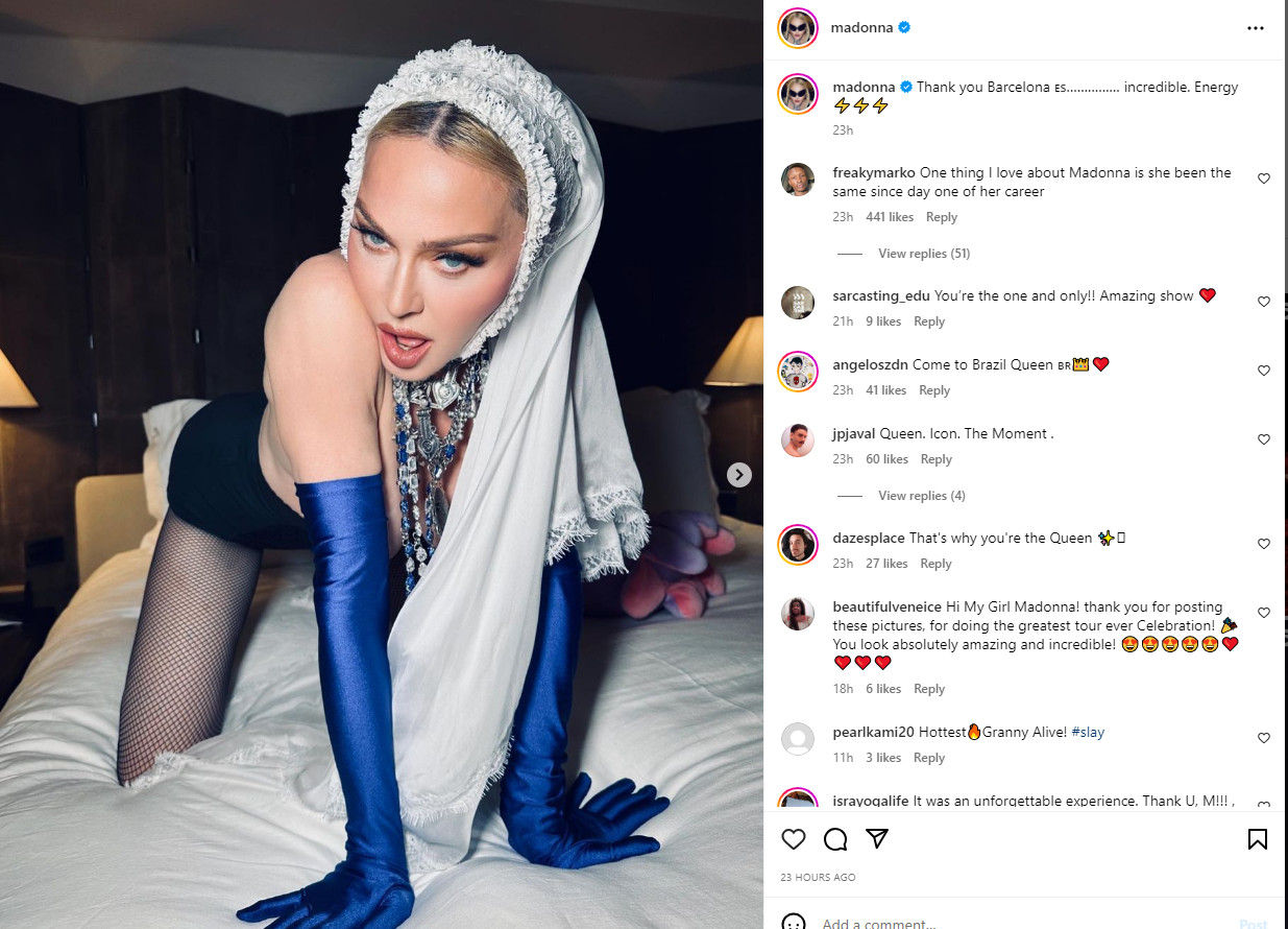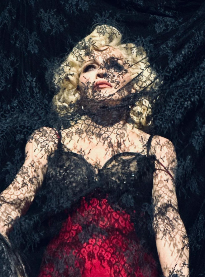 Με μια εικόνα που έχει καταργήσει πλήρως τόσο την ηλικία της όσο και το πέρασμα του χρόνου από πάνω της, δίνει εναλλακτικές πόζες τόσο από το κρεβάτι της όσο και από τη σκηνή που εμφανίστηκε στην Ισπανία.
