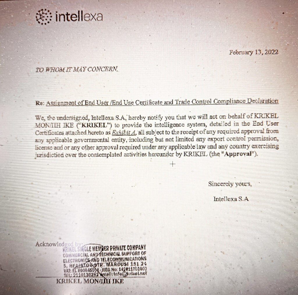 Μάλιστα, στο συγκεκριμένο έγγραφο αναφέρεται ότι η Intellexa θα ενεργήσει για λογαριασμό της Krikel (Γιάννης Λαβράνος).