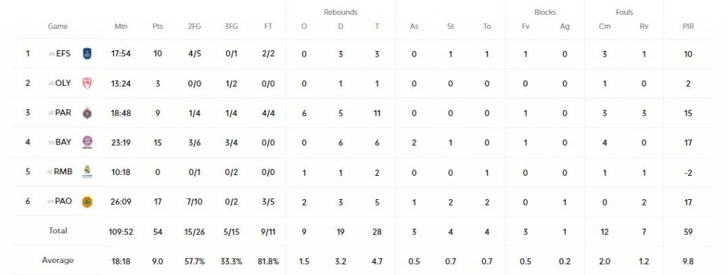 Οι μέσοι όροι του στη Euroleague μετά από 6 παιχνίδια είναι 9 πόντοι, 4,7 ριμπάουντ, 0,7 κλεψίματα, 0,5 κοψίματα και 9,8 στο σύστημα αξιολόγησης.