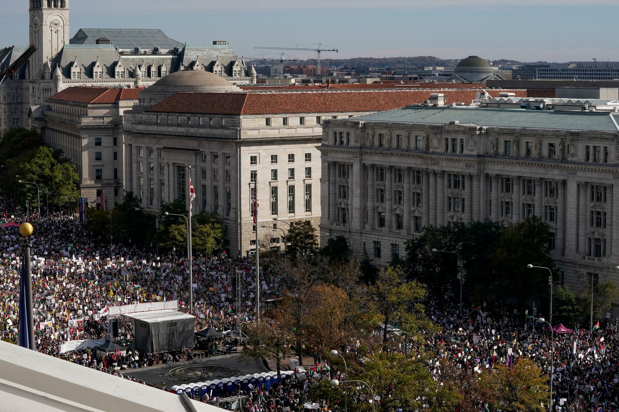 Πλήθος διαδηλωτών από τους δεκάδες χιλιάδες που βρέθηκαν στη συγκέντρωση υπέρ της Παλαιστίνης στην Ουάσινγκτον το Σάββατο ζητώντας κατάπαυση του πυρός στη Λωρίδα της Γάζας, πραγματοποίησαν πορεία προς την πύλη του Λευκού Οίκου, όπου μάλιστα φώναξαν συνθήματα κατά του Τζο Μπάιντεν και έβαψαν την εξωτερική πύλη με κόκκινη μπογιά.