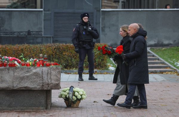 Η πρέσβειρα των ΗΠΑ στη Ρωσία Λιν Τρέισ καταθέτει λουλούδια στο μνημείο Solovetsky Stone την παραμονή της ημέρας μνήμης για τα θύματα της πολιτικής καταστολής στη Μόσχα, Ρωσία, 29 Οκτωβρίου 2023 (REUTERS).