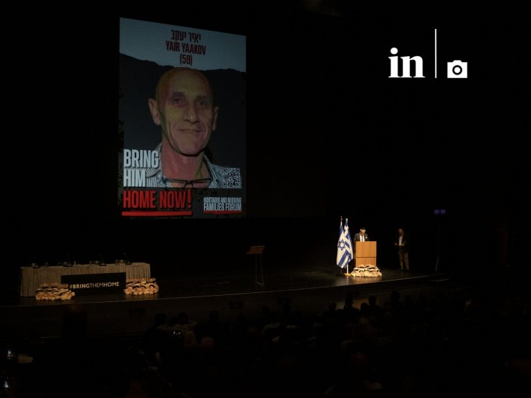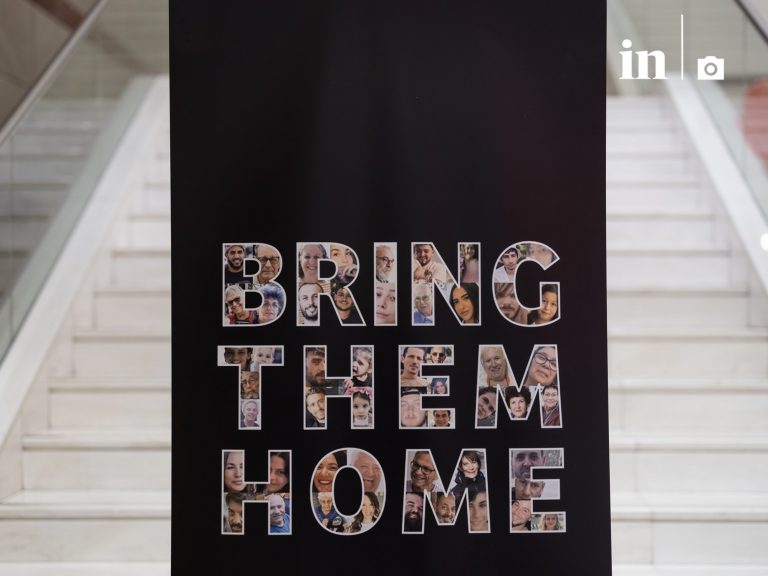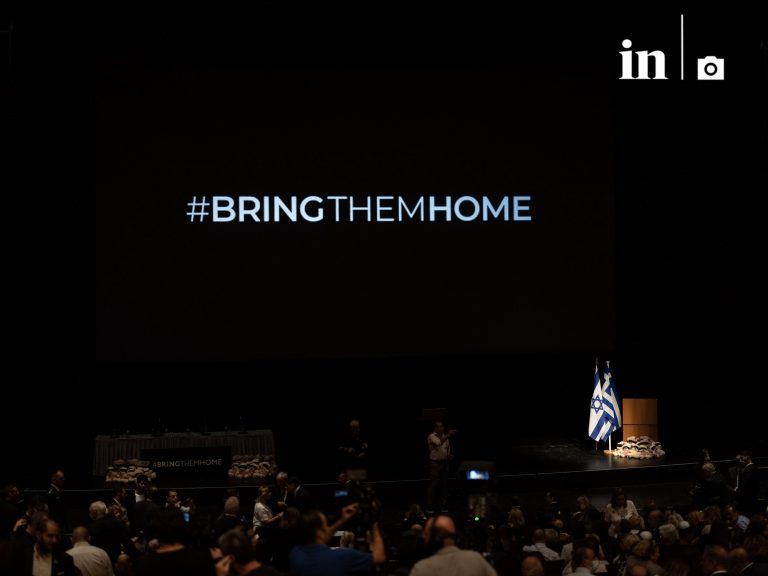 Φτάνοντας στην αίθουσα είναι στημένο ένα τραπέζι. Οι καλεσμένοι δεν είναι εδώ. Οι καρέκλες είναι κενές. Οι 242 καρέκλες του δείπνου έχουν τοποθετημένες πάνω τους τις φωτογραφίες των απαχθέντων από τη Χαμάς. Το σύνθημα είναι «#bring them home». Νεαρά παιδιά κουβαλάνε μαύρα μπαλόνια. Είναι μια ημέρα πένθους για τα 1400 θύματα του Ισραήλ από την επίθεση της Χαμάς, αλλά και μια ημέρα ελπίδας πως οι απαχθέντες συγγενείς θα επιστρέψουν σπίτι τους.