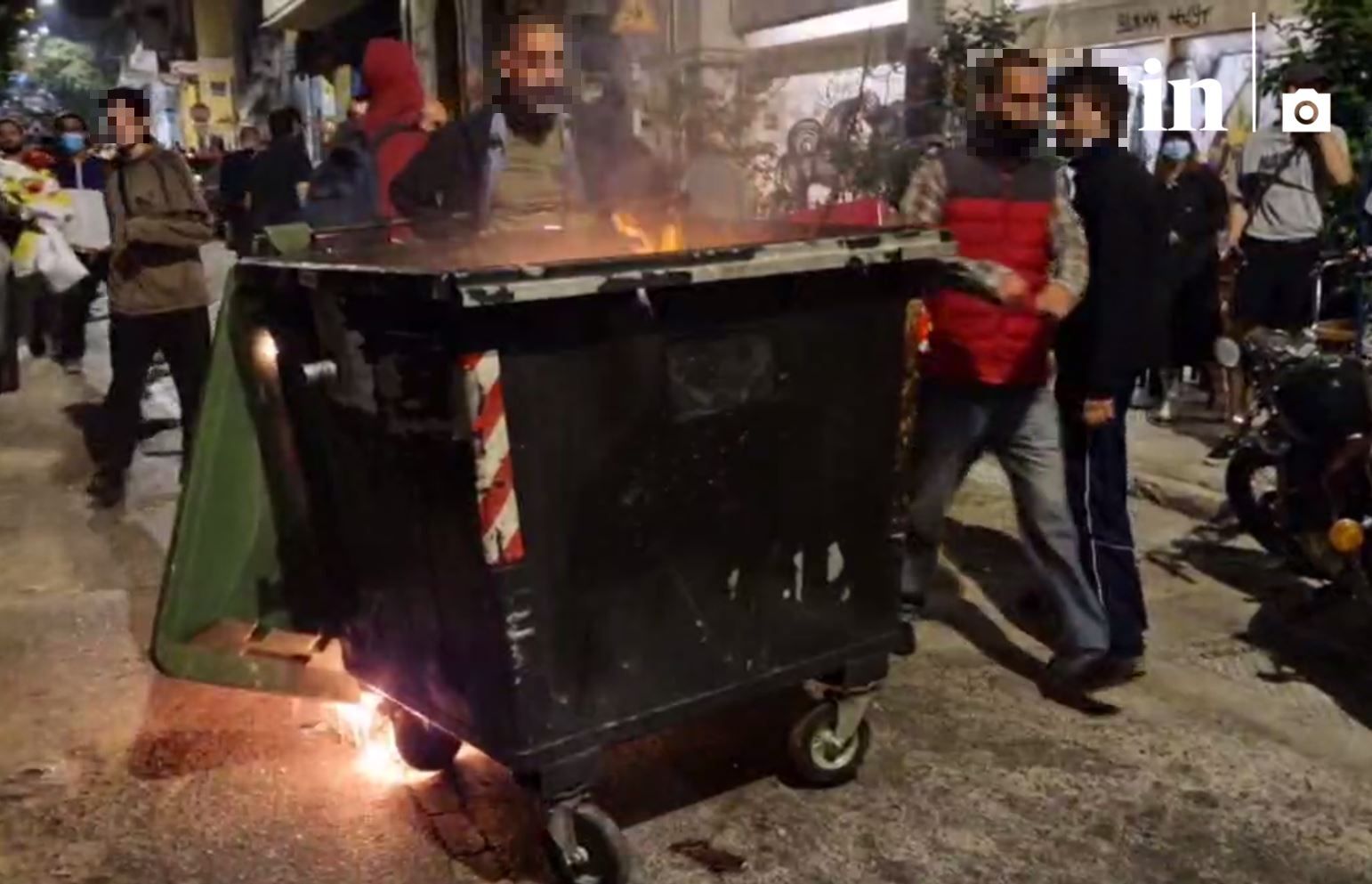 Η πορεία οπισθοχώρησε και στην Εμμανουήλ Μπενάκη άτομα έβαλαν φωτιά σε κάδο απορριμμάτων.