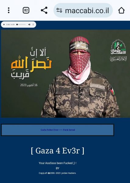 Ιορδανοί χάκερ παραβίασαν την ιστοσελίδα της ομάδας ποδοσφαίρου της Μακάμπι Τελ Αβίβ και στην θέση της έβαλαν τον εκπρόσωπο τύπου της Χαμάς «Αμπού Ουμπέιντα» (παρατσούκλι από παλαιότερο θρυλικό μαχητή της Χαμάς).