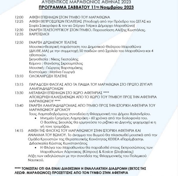 Στην δημοσιότητα έδωσε ο Δήμος Μαραθώνος, το πρόγραμμα του Σαββάτου 11 Νοεμβρίου για τον αυθεντικό Μαραθώνιο της Αθήνας.