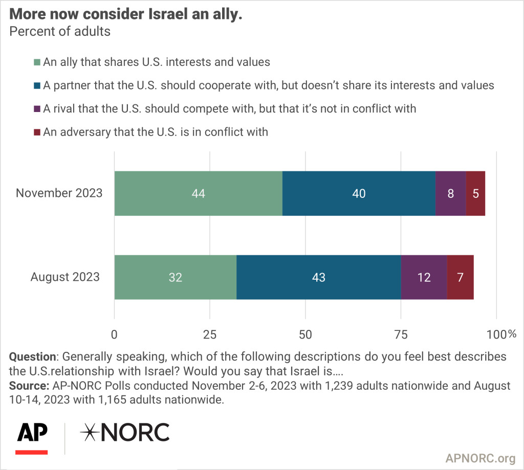 Το 44% του συμμετεχόντων στην έρευνα θεωρεί το Ισραήλ σύμμαχο που μοιράζεται κοινά συμφέροντα και αξίες με τις ΗΠΑ. Αυτό είναι αυξημένο κατά 12% σε σχέση με το 32% που ήταν τα ευρήματα της έρευνας τον Αύγουστο, πριν από την έναρξη της τρέχουσας σύγκρουσης του Ισραήλ με τη Χαμάς.
