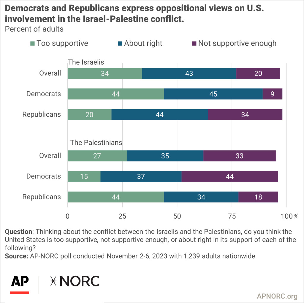 Το κοινό είναι πιο πιθανό να πιστεύει ότι οι Ηνωμένες Πολιτείες υποστηρίζουν υπερβολικά οποιαδήποτε από τις δύο ομάδες από την τελευταία φορά που τέθηκε το ερώτημα στη δημοσκόπηση του AP-NORC Center τον Αύγουστο και πριν από την έναρξη του πολέμου.