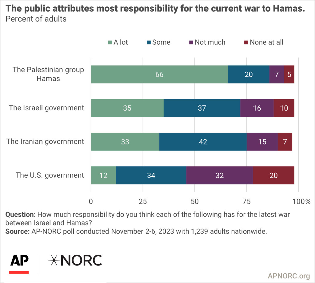 Τα δύο τρίτα των συμμετεχόντων στη δημοσκόπηση θεωρεί ότι η Χαμάς φέρει μεγάλη ευθύνη για τον πόλεμο, ενώ το 35% υποστηρίζει το ίδιο για την ισραηλινή κυβέρνηση. Το ένα τρίτο λέει ότι η κυβέρνηση του Ιράν έχει μεγάλη ευθύνη για τη σύγκρουση. Μάλιστα υπάρχει ένα 12% που πιστεύει ότι οι ΗΠΑ έχουν μεγάλη ευθύνη.