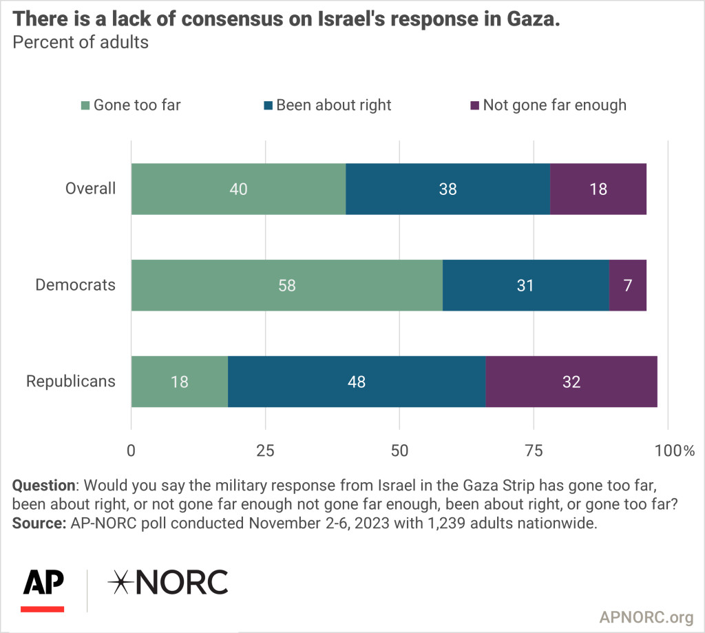 Οι Ρεπουμπλικάνοι είναι πιο πιθανό από τους Δημοκρατικούς να πουν ότι η παροχή βοήθειας στον στρατό του Ισραήλ είναι ένας πολύ σημαντικός στόχος εξωτερικής πολιτικής των ΗΠΑ (48% έναντι 30%), ενώ οι Δημοκρατικοί είναι πιο πιθανό να δώσουν προτεραιότητα στην πρόληψη των χτυπημάτων σε βάρος των Παλαιστινίων πολιτών (63% έναντι 33%), στην παροχή ανθρωπιστικής βοήθειας (64% έναντι 29%) και στην απελευθέρωση των ομήρων (70% έναντι 60%).