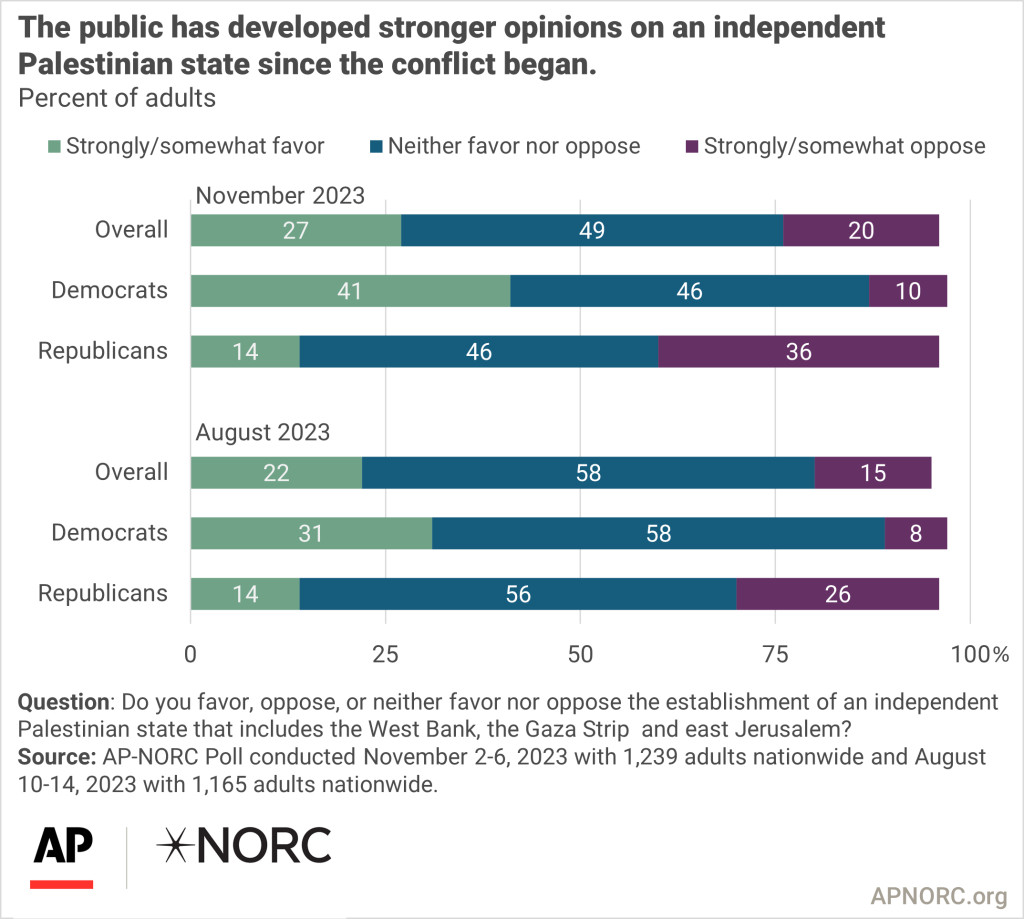 Τους τελευταίους μήνες, η αντίθεση στη δημιουργία ενός ανεξάρτητου παλαιστινιακού κράτους έχει αυξηθεί ελαφρώς μεταξύ των Ρεπουμπλικανών. Οι Δημοκρατικοί από την άλλη πλευρά έχουν αρχίσει να γίνονται ελαφρώς πιο υποστηρικτικοί ως προς την ιδέα (31% και 41% αντίστοιχα).