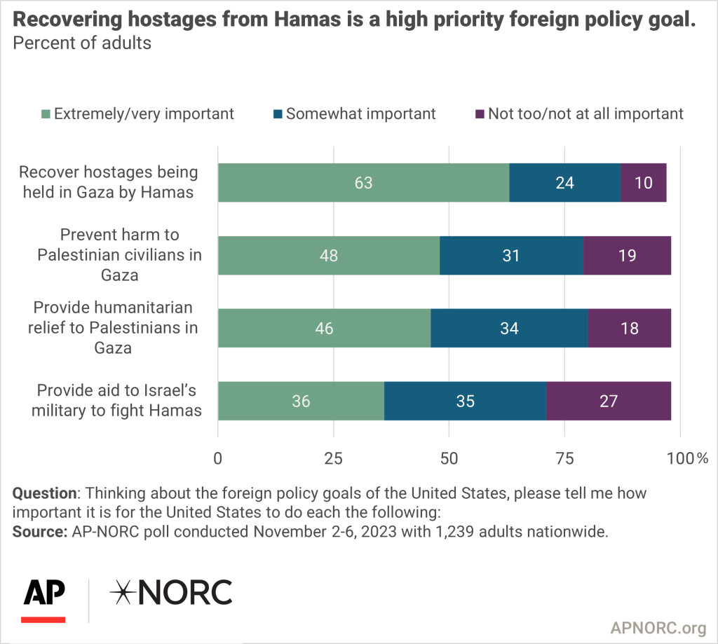Σχεδόν τα δύο τρίτα των Αμερικανών υποστηρίζουν ότι η απελευθέρωση των ομήρων που κρατούνται στη Γάζα από τη Χαμάς θα πρέπει να αποτελεί ύψιστη προτεραιότητα των Ηνωμένων Πολιτειών και περίπου οι μισοί λένε το ίδιο για την πρόληψη της βλάβης ή την παροχή ανθρωπιστικής βοήθειας στους Παλαιστίνιους πολίτες.