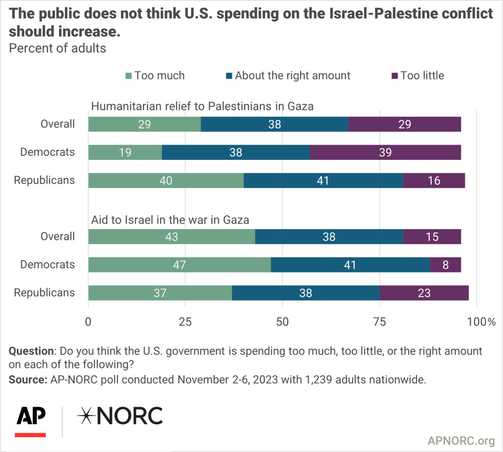 Λιγότερο από το ένα τρίτο του των συμμετεχόντων στην έρευνα πιστεύει ότι οι ΗΠΑ πρέπει να δαπανήσουν περισσότερα για τη σύγκρουση. Το 38% πιστεύει ότι οι δαπάνες των ΗΠΑ για την ανθρωπιστική προσπάθεια υπέρ των Παλαιστινίων στη Γάζα και τη βοήθεια προς το Ισραήλ είναι περίπου σωστές.