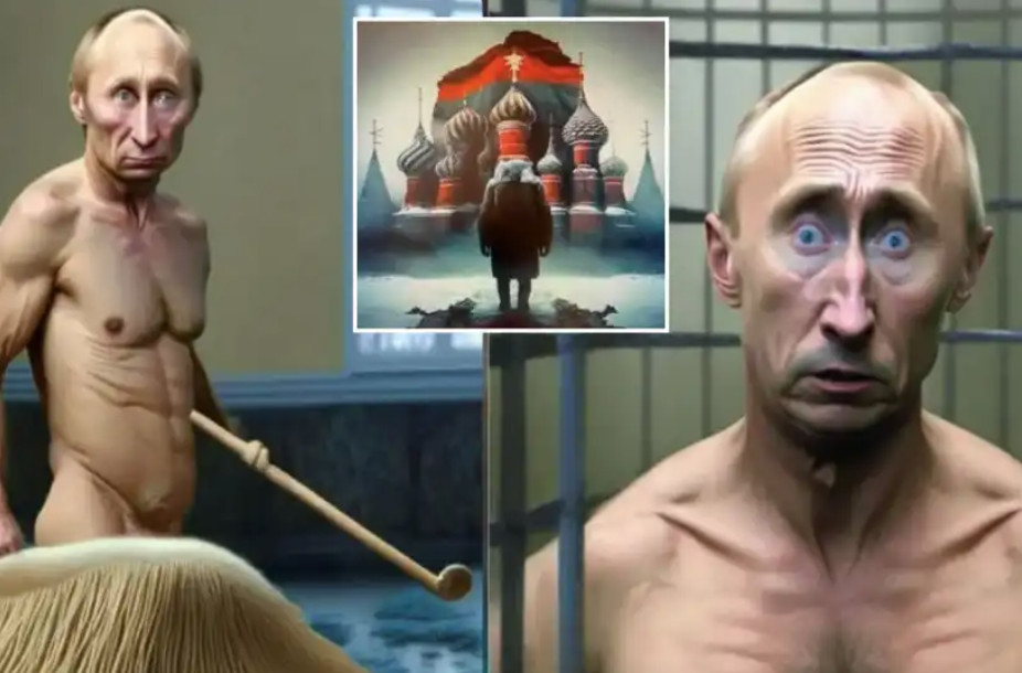 Σε μία από τις φωτογραφίες που δημιουργήθηκαν το AI chatbot δείχνει έναν γυμνό Πούτιν να στέκεται όρθιος και να κρατά ένα ξύλινο κοντάρι, ενώ σε μια άλλη φαίνεται ο Ρώσος πρόεδρος τρομοκρατημένος μέσα σε κελί.