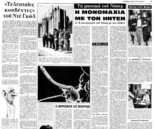 *Δημοσίευμα του «Βήματος» αναφορικά με το βιβλίο του γάλλου δημοσιογράφου Φρεντερίκ Μπαρέρ (Frédéric Barreyre) για τον Σαρλ ντε Γκωλ, που έφερε τον τίτλο Les derniers mots du Général και είχε κυκλοφορήσει στο Παρίσι το 1971. Το εν λόγω άρθρο, υπό τον τίτλο «Τελευταίες κουβέντες» του Ντε Γκωλ, είχε δημοσιευτεί στο «Βήμα» στις 23 Σεπτεμβρίου 1971.