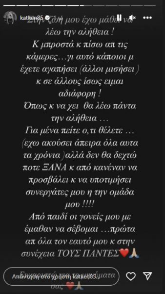 «Στη ζωή μου έχω μάθει να λέω την αλήθεια! Και μπροστά και πίσω από τις κάμερες. Γι’ αυτό κάποιοι με έχετε αγαπήσει (άλλοι μισήσει) και σε άλλους ίσως είμαι αδιάφορη. Όπως και να ‘χει, θα λέω πάντα την αλήθεια. Για μένα πείτε ό,τι θέλετε (έχω ακούσει άπειρα όλα αυτά τα χρόνια). Αλλά, δεν θα δεχτώ ποτέ ξανά και από κανέναν να προσβάλλει και να υποτιμήσει συνεργάτες μου ή την ομάδα μου. Από παιδί οι γονείς μου με έμαθαν να σέβομαι, πρώτα απ’ όλα τον εαυτό μου και στη συνέχεια τους πάντες. Ευχαριστώ για τα μηνύματά σας», έγραψε χαρακτηριστικά η Κατερίνα Καινούργιου.