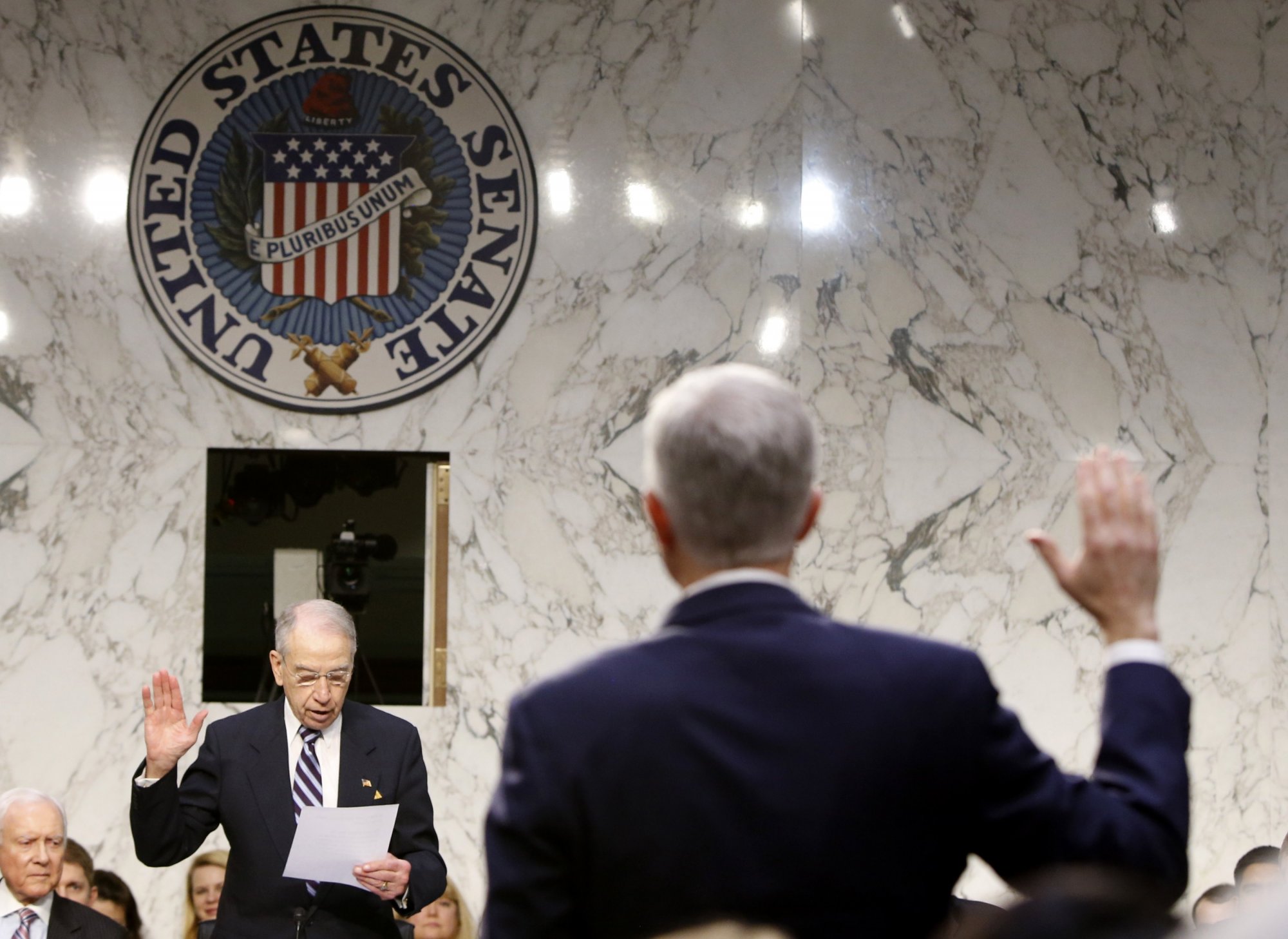 O διευθυντής του FBI Τζέιμς Κόμεϊ, προτού καταθέσει ενώπιον της Επιτροπής Πληροφοριών της Βουλής των Αντιπροσώπων, ορκίζεται μπροστά στον γερουσιαστή Τσακ Γκράσλεϊ, ο οποίος είναι 90 ετών σήμερα.