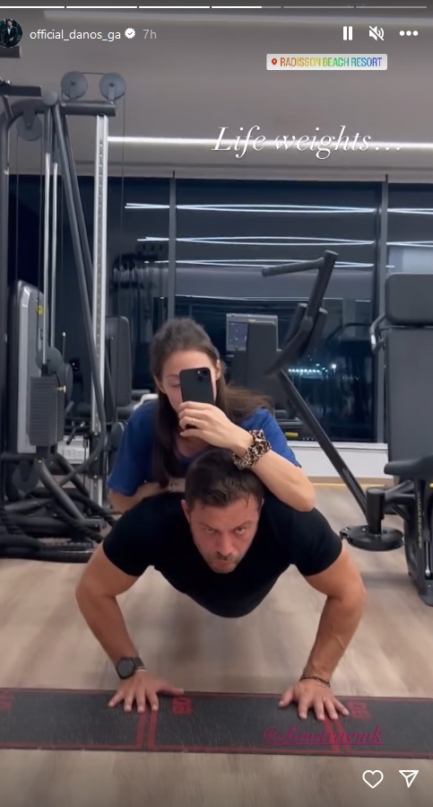 Όπως διακρίνεται σε ανάρτηση που πραγματοποίησε στο Instagram, ο Γιώργος Αγγελόπουλος σηκώνει τη Δήμητρα Βαμβακούση κάνοντας push ups. Η γυναίκα του τραβάει το βίντεο που αργότερα ανήρτησαν στα μέσα κοινωνικής δικτύωσης.
