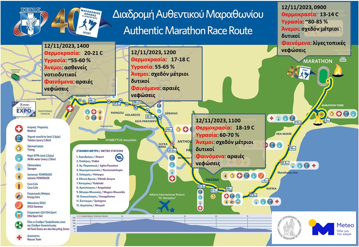Στην εικόνα παρουσιάζεται η διαδρομή σύμφωνα με τη διοργανώτρια αρχή (https://www.athensauthenticmarathon.gr/) καθώς και οι καιρικές συνθήκες που αναμένονται κατά μήκος αυτής, σε ενδεικτικές χρονικές στιγμές.