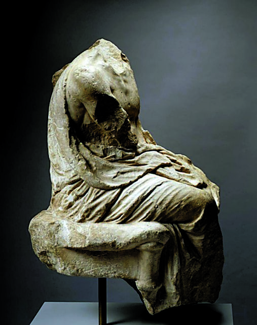 Πρόκειται για ένα αττικό επιτύμβιο ανάγλυφο, διαστάσεων 96,5 x 59,7 x 27,3 εκ., το οποίο ανασκάφηκε στην ευρύτερη περιοχή της Αθήνας. Αναπαριστά μια καθιστή μορφή – έναν ημίγυμνο άνδρα που φορά ιμάτιο τυλιγμένο γύρω από τους μηρούς του και περασμένο πάνω από τον αριστερό του ώμο – η οποία σμιλεύθηκε από πεντελικό μάρμαρο μεταξύ 350 και 325 π.Χ.