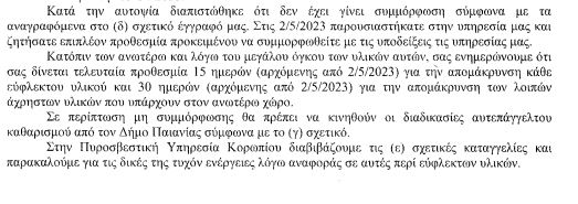 Λαμβάνοντας υπόψη τη σοβαρότητα της κατάστασης (εκδήλωση πυρκαγιάς το 2019) παρακαλούνται οι Υπηρεσίες :