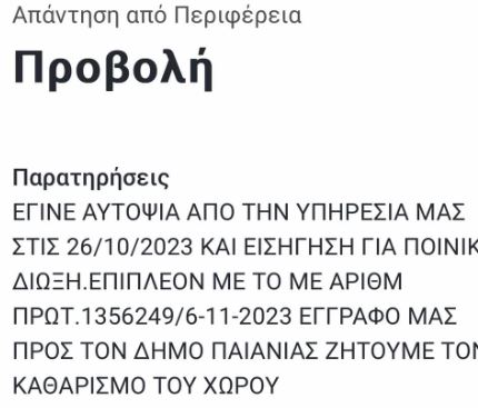 Κατόπιν όλων των ανωτέρω και κρίνοντας ότι ο …………. αδιαφορεί για τις παραπάνω συστάσεις, αφού από το 2009 δεν έχει προβεί σε καμιά ενέργεια απομάκρυνσης των υλικών και συμμόρφωσης με το σχετικό νομικό πλαίσιο, καταγγέλλουμε εγγράφως τα παραπάνω στο Δήμο Παιανίας μια τελευταία φορά, κοινοποιώντας τα στους σχετικούς αναγραφόμενους φορείς, ζητώντας τις άμεσες ενέργειες προστασίας μας, αλλιώς θα προβούμε σε μηνυτήριες αναφορές κατά παντός υπευθύνου, ασκώντας το νόμιμο δικαίωμά μας για την προστασία μας και την προστασία των παιδιών μας».