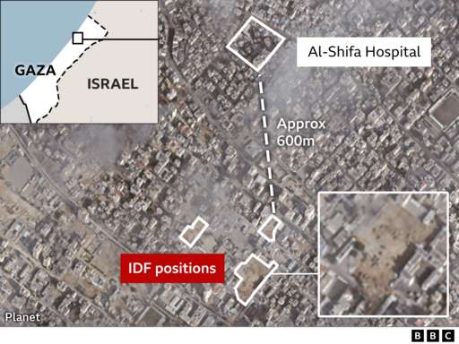 Καθώς ο ισραηλινός στρατός συνεχίζει την επίθεσή του στην πόλης της Γάζας, το BBC Verify δημοσιεύει μια δορυφορική εικόνα της περιοχής γύρω από το νοσοκομείο Αλ Σίφα, το οποίο σφυροκοπάται ανηλεώς εδώ και μέρες.