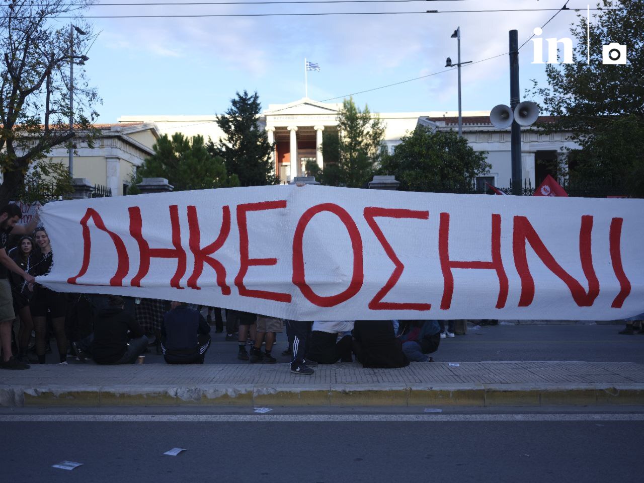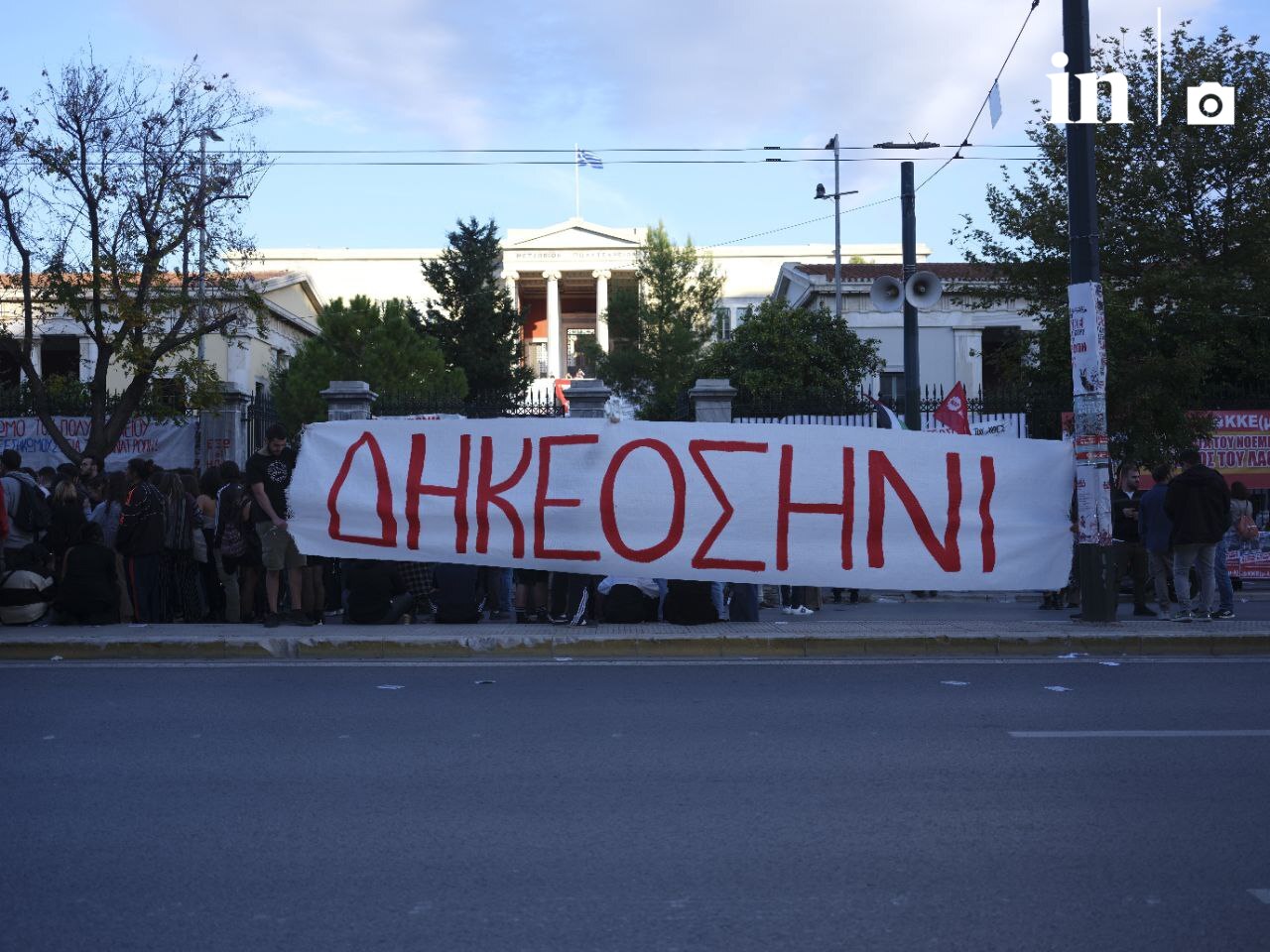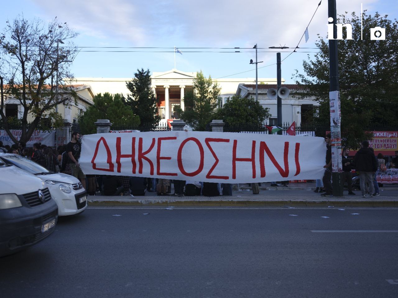 Μια μεγάλη ομάδα φοιτητών βγήκε στην Πατησίων από τον προαύλιο χώρο του Πολυτεχνείου όπου είναι σε εξέλιξη ο τριήμερος εορτασμός, κρατώντας ένας μεγάλο πανό που έγραφε «ΔΗΚΕΟΣΗΝΙ»