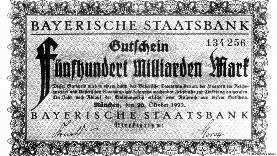 Μετά τον Α’ Παγκόσμιο Πόλεμο η γερμανική οικονομία είχε καταρρεύσει. Το δημόσιο χρέος αυξανόταν συνεχώς και το κράτος τύπωνε χρήμα για να το αναχρηματοδοτήσει, προκαλώντας έναν φαύλο κύκλο υποτιμήσεων του μάρκου. Το 1923 η αξία του νομίσματος είχε συρρικνωθεί τόσο πολύ, ώστε πολλές επιχειρήσεις πλήρωναν μισθούς καθημερινά, ο κόσμος κουβαλούσε τεράστιους όγκους χαρτονομισμάτων για να ψωνίσει στον μανάβη και όλοι προσπαθούσαν να ξεφορτωθούν τα χρήματά τους όσο γίνεται πιο γρήγορα. Γιατί πολλές φορές, από τη στιγμή που έμπαιναν στην ουρά για να πληρώσουν μέχρι να φτάσουν στο ταμείο, οι τιμές των αγαθών πολλαπλασιάζονταν…