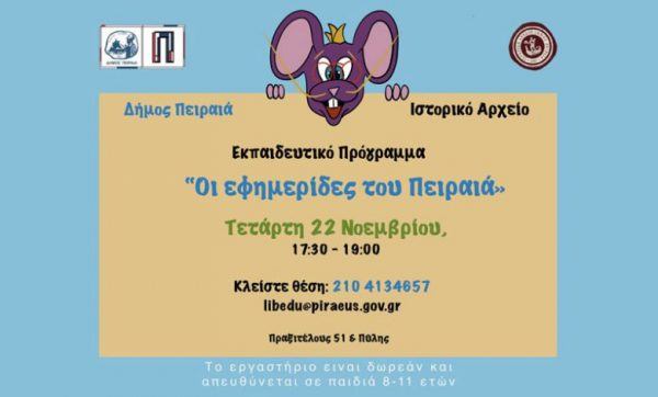 Λόγω της μεγάλης συμμετοχής παιδιών, το Ιστορικό Αρχείο του Δήμου Πειραιά θα επαναλάβει το εκπαιδευτικό πρόγραμμα με θέμα: «Οι εφημερίδες του Πειραιά», την Τετάρτη, 22 Νοεμβρίου, από τις 17:30 έως τις 19:00, για μαθητές και μαθήτριες από 8 έως 11 ετών.