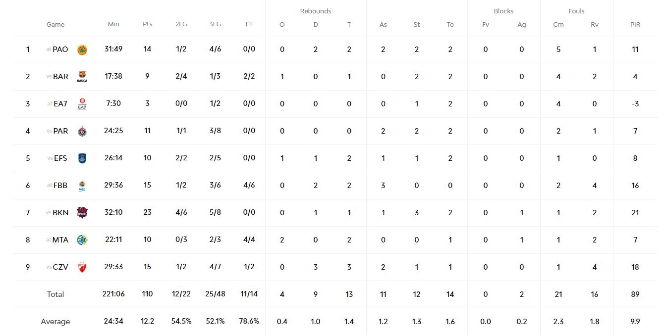 Παράλληλα στα μόνα ματς που δεν έχει διψήφιο αριθμό πόντων ήταν σε εκείνα που έπαιξε και λιγότερο. Δηλαδή κόντρα στην Αρμάνι Μιλάνο (3π.) που αποβλήθηκε έχοντας μείνει στο παρκέ μόλις 7 λεπτά, ενώ με την Μπαρτσελόνα είχε 9 πόντους σε 17′. Κατά τα άλλα μετρά δύο ματς με 15 πόντους συν το παιχνίδι με την Μπασκόνια (23π). Μέσα σε όλα αυτά παίζει και εξαιρετική άμυνα, πιέζοντας άψογα πάνω στην μπάλα τον εκάστοτε χειριστή. Κάτι που μαρτυρούν και τα 1,3 κλεψίματα που κάνει ανά ματς.