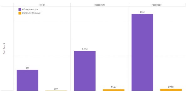 Σύγκριση των hashtags #freepalestine και #standwithisrael στις τρεις δημοφιλέστερες πλατφόρμες.
