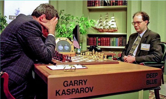 Στις 10 Φεβρουαρίου του 1996 στη Νέα Υόρκη το «Απέραντο Γαλάζιο» («Deep Blue»), ένας υπολογιστής της ΙΒΜ, μέτρησε τις πνευματικές δυνάμεις του απέναντι στον δημιουργό του: τον Ανθρωπο, εκπροσωπούμενο από τον παγκόσμιο πρωταθλητή και κορυφαίο σκακιστή Γκάρι Κασπάροφ. Λίγοι πίστευαν ότι μια σκακιστική ιδιοφυΐα θα ήταν δυνατόν να ηττηθεί από μια μηχανή σε μπλε κέλυφος. Και όμως! Στο τέλος του παιχνιδιού, ο Κασπάροφ καλύπτει συντετριμμένος το πρόσωπο με τις παλάμες, αποδεχόμενος την πικρή ήττα.