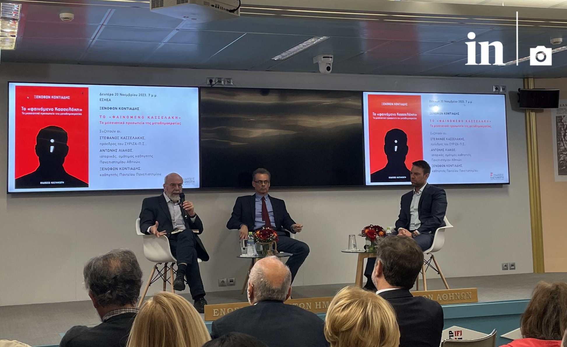Συζήτηση σε έντονους -κατά στιγμές- τόνους σημειώθηκε κατά την παρουσίαση του βιβλίου «Το φαινόμενο Κασσελάκη. Το μεσσιανικό προσωπείο της μεταδημοκρατίας» με ομιλητές τον συγγραφέα του βιβλίου καθηγητή Ξενοφών Κοντιάδη, τον πρόεδρο του ΣΥΡΙΖΑ -Προοδευτική Συμμαχία Στέφανο Κασσελάκη, που ζήτησε να συμμετέχει στο πάνελ, και τον ιστορικό Αντώνη Λιάκο.
