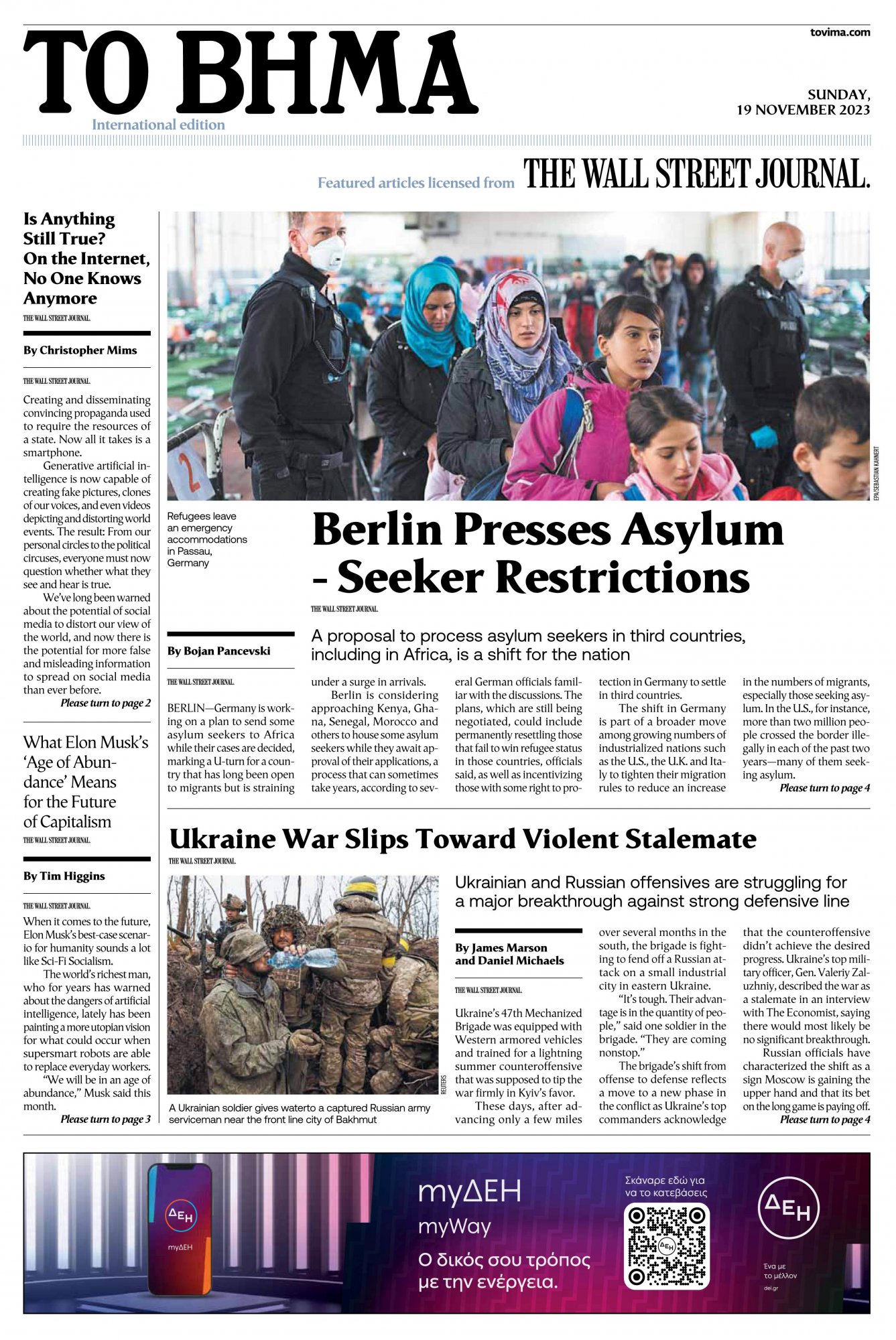 Η εφημερίδα «ΤΟ ΒΗΜΑ» θα φιλοξενεί κάθε Κυριακή ένα ειδικό Αγγλόφωνο ένθετο σε συνεργασία με την «WALL STREET JOURNAL» και θα προσφέρει στους αναγνώστες της μία επιλογή από τα σημαντικότερα πρόσφατα άρθρα και αναλύσεις της Αμερικανικής εφημερίδας.