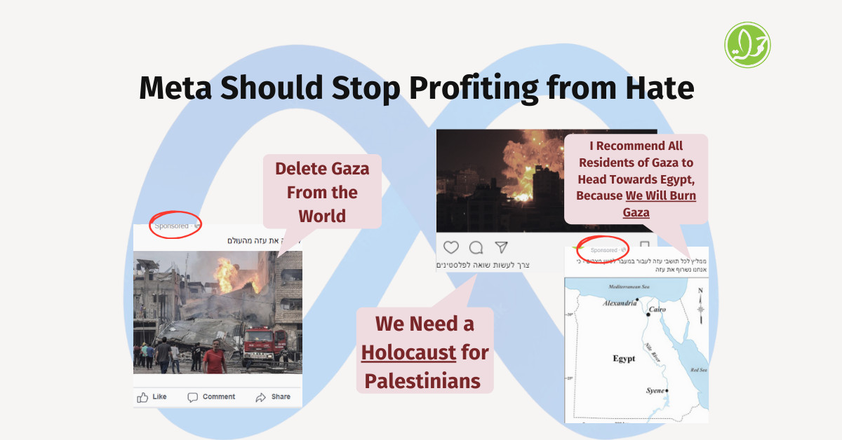 Μια έρευνα του 7amleh – The Arab Center for the Advancement of Social Media σχετικά με την ικανότητα της Meta να απαγορεύει τη ρητορική μίσους και την υποκίνηση σε πληρωμένες διαφημίσεις αποκάλυψε μια ανησυχητική πραγματικότητα: Η Meta αποκομίζει οικονομικά οφέλη από τη διάδοση επιβλαβούς περιεχομένου στις πλατφόρμες της. Συμπεριλαμβάνεται και ο πόλεμος που λαμβάνει χώρα στην Γάζα.