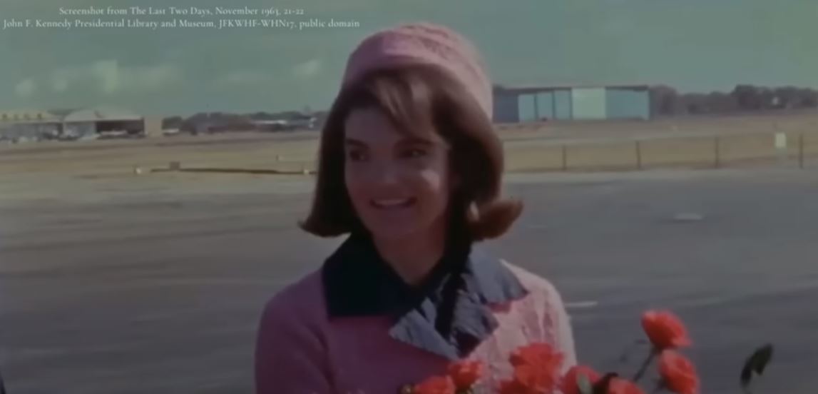 Η Τζάκι φορούσε το ροζ κοστούμι, μαζί με ένα ασορτί ροζ καπέλο pillbox και ένα ζευγάρι λευκά γάντια τη στιγμή που ο πρόεδρος Κένεντι πυροβολήθηκε και σκοτώθηκε ενώ επέβαινε στο πίσω μέρος μιας ανοιχτής λιμουζίνας μαζί με τη σύζυγό του.