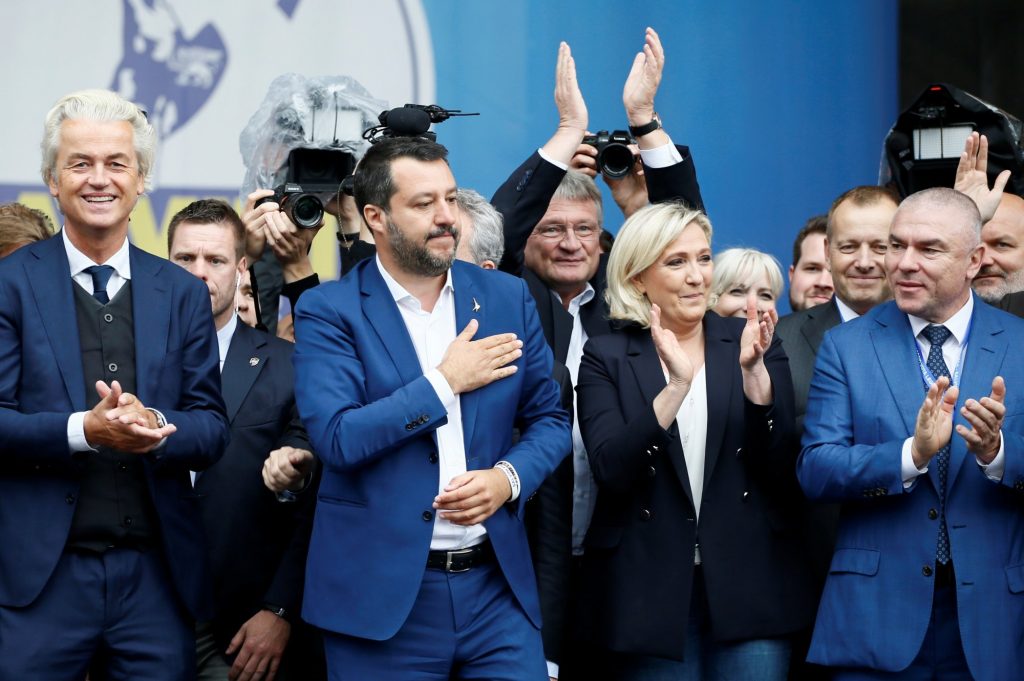Ο Γκέερτ Βίλντερς με τον Ιταλό Ματέο Σαλβίνι και την Γαλλίδα Μαρίν Λεπέν σε συγκέντρωση εθνικιστικών και ακροδεξιών κομμάτων προ των ευρωεκλογών του 2019