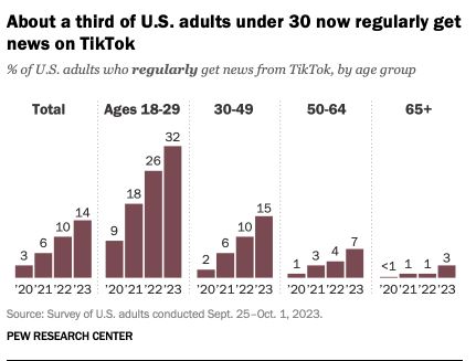 Περισσότεροι από τους ενήλικες χρήστες του TikTok στις ΗΠΑ διαβάζουν επίσης ειδήσεις εκεί. Επί του παρόντος, το 43% των χρηστών του TikTok δηλώνουν ότι ενημερώνονται τακτικά από τον ιστότοπο, από 33% που δήλωναν το ίδιο το 2022.