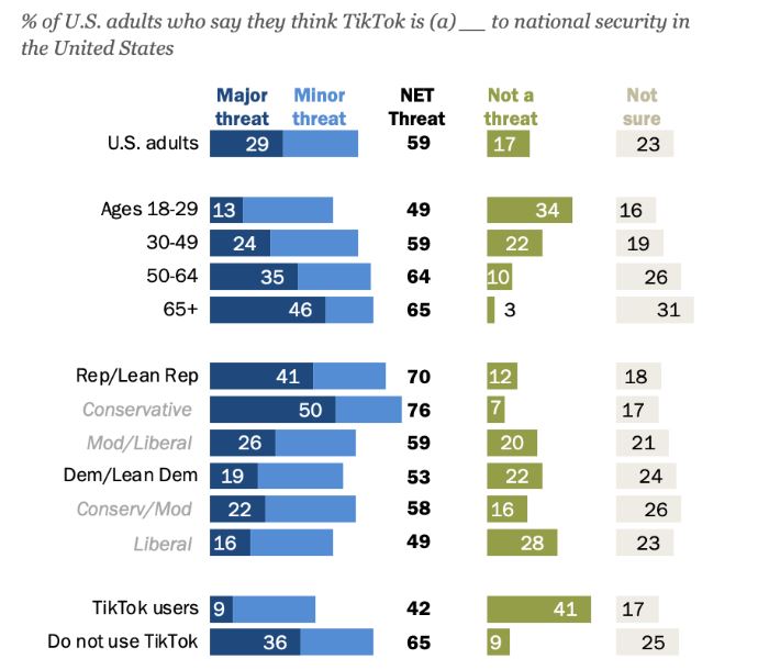 Οι απόψεις για το TikTok ως απειλή διαφέρουν επίσης ανάλογα με την ηλικία. Μόλις το 13% των ενηλίκων, ηλικίας 18 έως 29 ετών, δηλώνει ότι το TikTok αποτελεί σημαντική απειλή. Το ποσοστό αυτό ανεβαίνει σταθερά σε όλες τις ηλικιακές ομάδες, φτάνοντας το 46% μεταξύ των Αμερικανών 65 ετών και άνω.