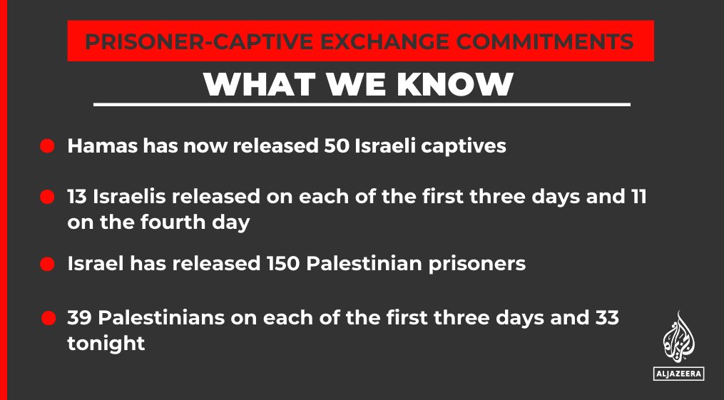 «Έχουμε από τη Χαμάς επιβεβαίωση τώρα ότι 20 επιπλέον όμηροι θα απελευθερωθούν τις επόμενες δύο ημέρες και για την παλαιστινιακή πλευρά αυτό θα σήμαινε ότι από τις ισραηλινές φυλακές θα απελευθερωθούν 65 Παλαιστίνιοι», τόνισε ο αλ-Ανσάρι.