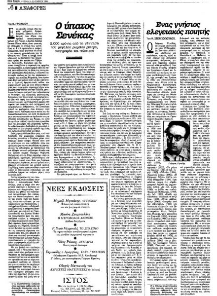 *Άρθρο του νεοελληνιστή φιλολόγου και πανεπιστημιακού Κώστα Στεργιόπουλου (1926-2016), διακεκριμένου λογοτέχνη και κριτικού της λογοτεχνίας, για τον Γιώργο Γεραλή. Το κείμενο του Στεργιόπουλου έφερε τον τίτλο «Ένας γνήσιος ελεγειακός ποιητής» και είχε δημοσιευτεί στην εφημερίδα «Το Βήμα» την Κυριακή 15 Δεκεμβρίου 1996.