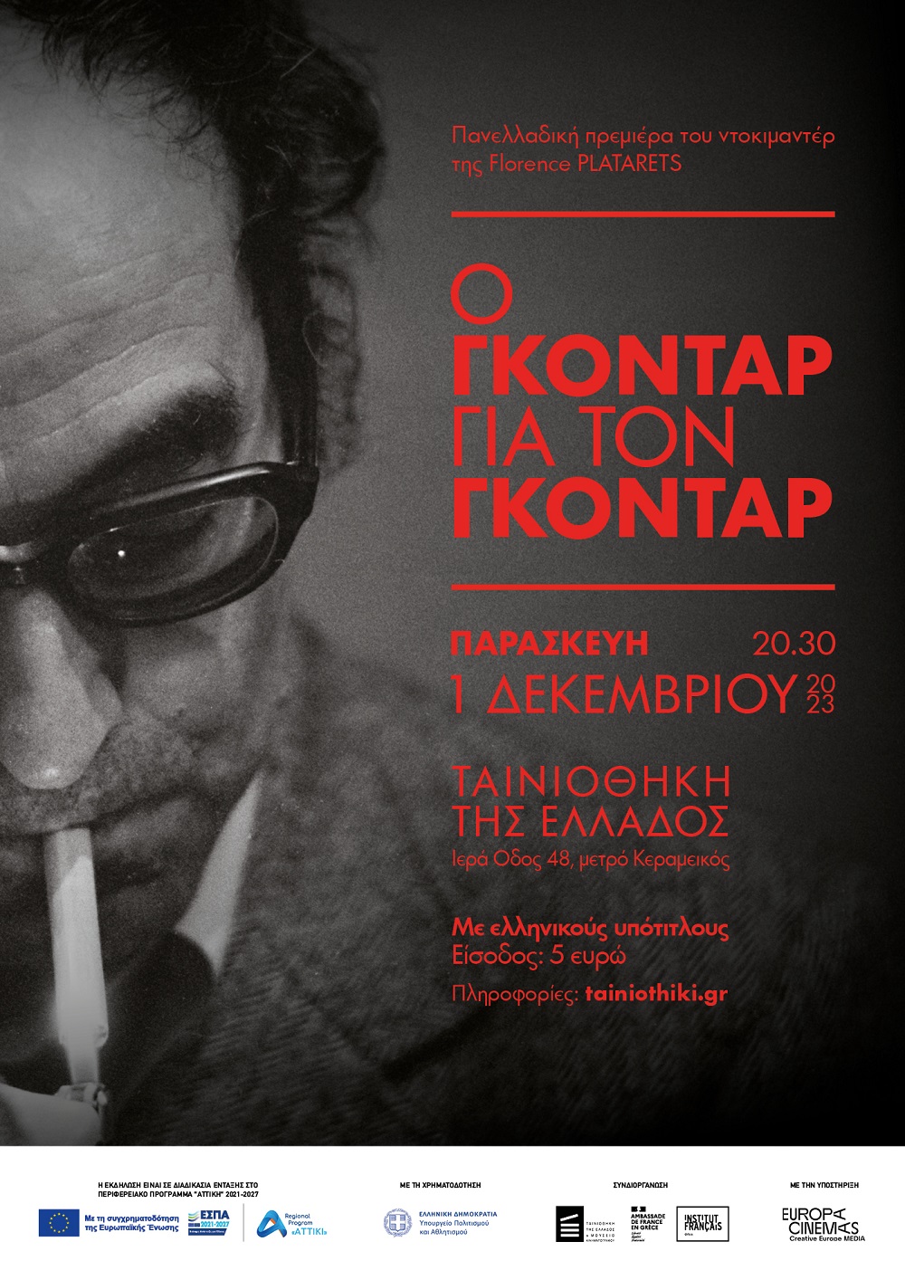 Η Ταινιοθήκη της Ελλάδος και το Γαλλικό Ινστιτούτο Ελλάδος παρουσιάζουν σε πανελλαδική πρεμιέρα το ντοκιμαντέρ της Φλοράνς Πλαταρέ, «Ο Γκοντάρ για τον Γκοντάρ».