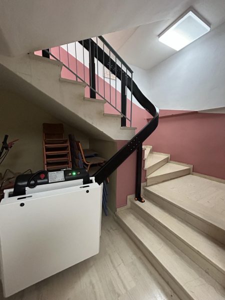 Η πλατφόρμα – ανελκυστήρας σκάλας για άτομα με ειδικές ανάγκες που τοποθετήθηκε είναι ένα μηχάνημα προσαρμοσμένο στις διαστάσεις της σκάλας, που μπορεί να φιλοξενήσει ολόκληρο το καρότσι και να το μεταφέρει σε όροφο, με όλα τα μέτρα ασφαλούς χρήσης και προστασίας.