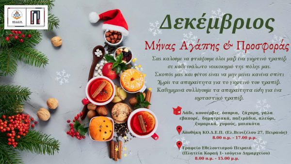 Πιο συγκεκριμένα, από 1 έως 29 Δεκεμβρίου, θα πραγματοποιείται καθημερινά συγκέντρωση βασικών διατροφικών αγαθών, τόσο στην αποθήκη της ΚΟ.Δ.Ε.Π. (Ελ. Βενιζέλου 27) 8:00-17:00 όσο και στο Γραφείο Εθελοντισμού του Δήμου Πειραιά (πλατεία Κοραή 1, Ισόγειο Δημαρχείου) 8:00-15:00.
