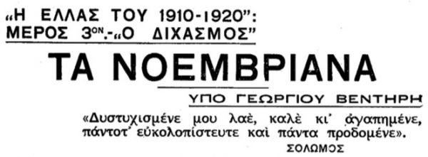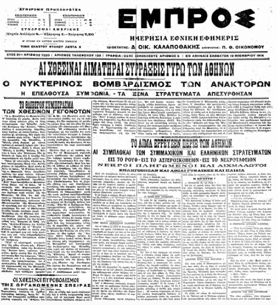 Την 1η Δεκεμβρίου 1916, και με την Ελλάδα διχασμένη από το Σεπτέμβριο του ίδιου έτους (επίσημη κυβέρνηση Αθηνών υπό τον έλεγχο του βασιλιά Κωνσταντίνου Α’ και κυβέρνηση Θεσσαλονίκης υπό τον Ελευθέριο Βενιζέλο), έλαβαν χώρα βίαιες συγκρούσεις στην Αθήνα και δευτερευόντως στην επαρχία. Οι συγκρούσεις αυτές, στις οποίες ενεπλάκησαν και για τις οποίες είχαν το δικό τους μερίδιο ευθύνης βενιζελικοί, αντιβενιζελικοί και ασφαλώς οι Σύμμαχοι, κατεγράφησαν στην ελληνική ιστοριογραφία ως Νοεμβριανά, καθώς στην Ελλάδα εκείνης της εποχής ήταν ακόμη σε χρήση το Ιουλιανό ημερολόγιο.