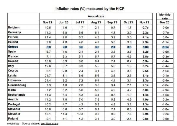 Σύμφωνα με τα επίσημα στοιχεία της Eurostat, sτο 3% διαμορφώθηκε ο πληθωρισμός στην Ελλάδα τον Νοέμβριο ενώ στο 2,4% για την ευρωζώνη.
