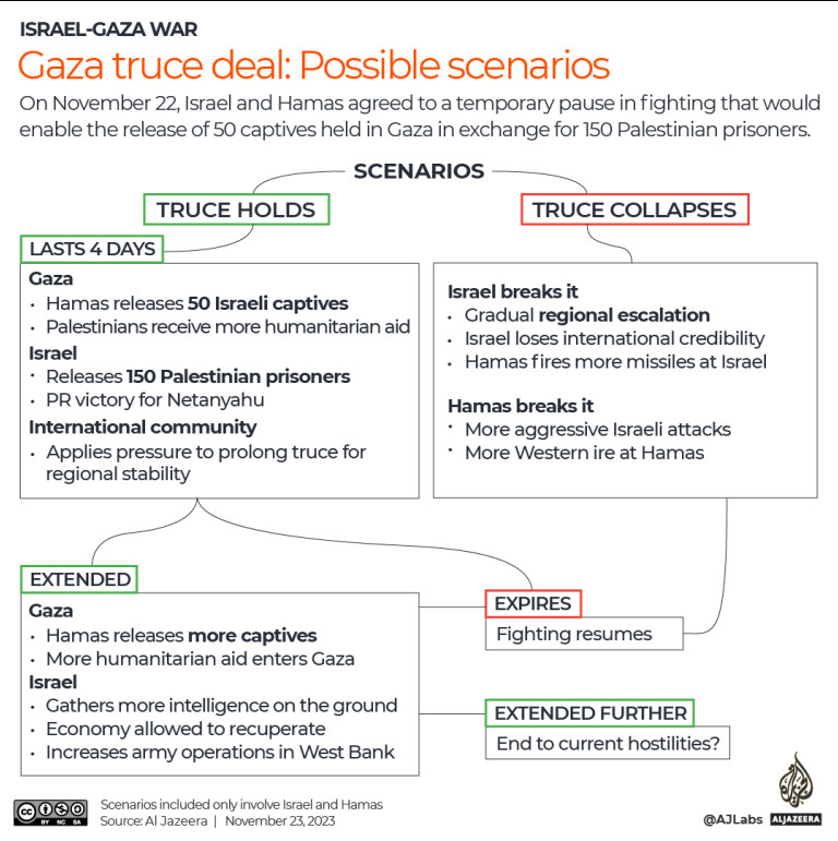 Η ανταποκρίτρια του Al Jazzera Χάμντα Σαλχούτ ενημερώνει σχετικά με την εκεχειρία πως «Οι Ισραηλινοί δεν έχουν προβεί σε καμία επίσημη ανακοίνωση ή επιβεβαίωση σχετικά με άλλη παράταση της εκεχειρίας.